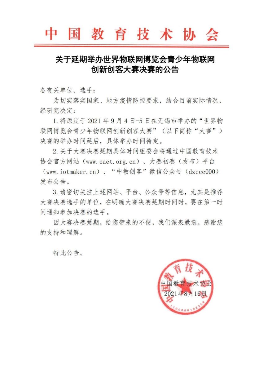 关于延期举办世界物联网博览会青少年物联网创新创客大赛决赛的公告