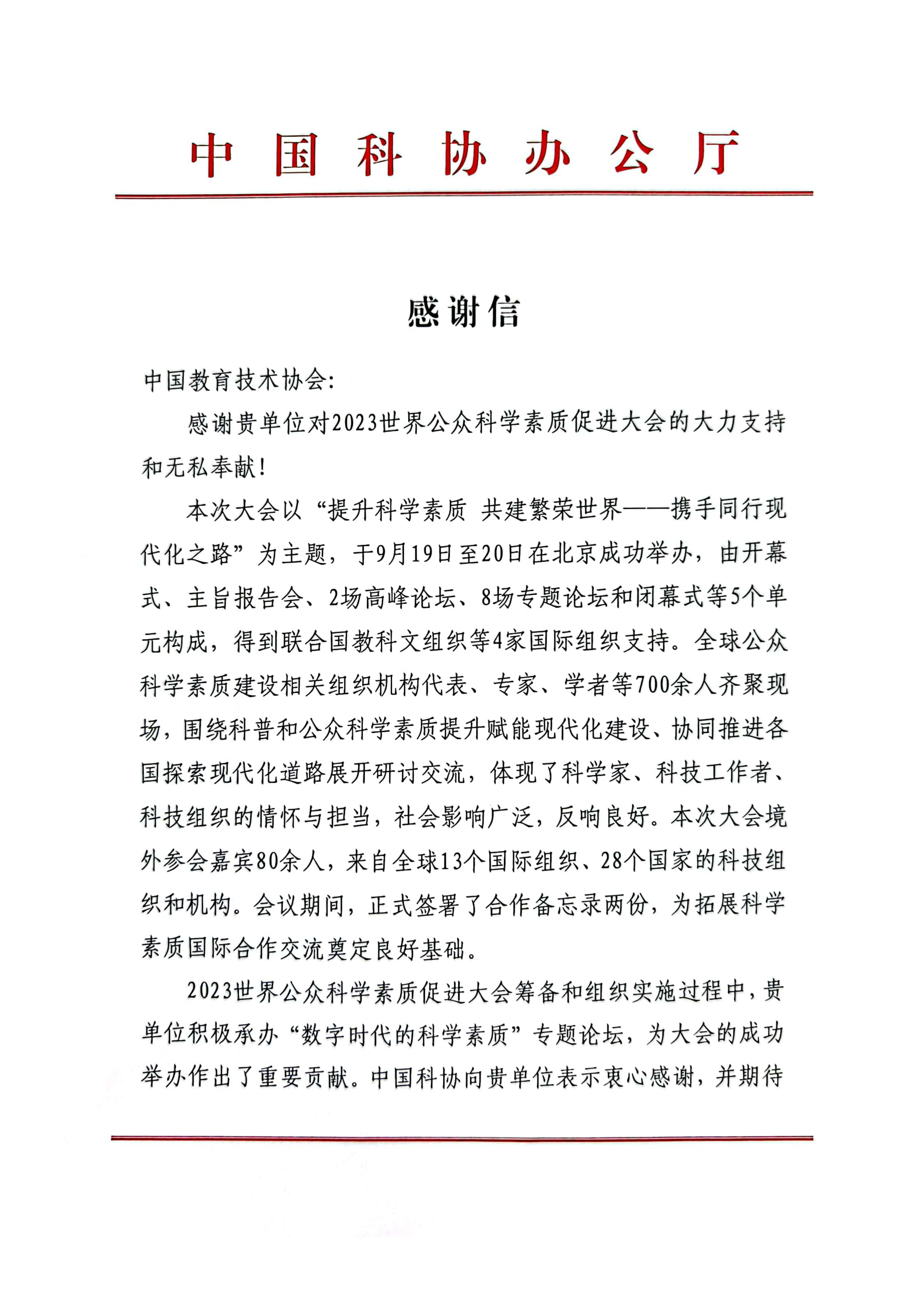 来自中国科协的感谢信