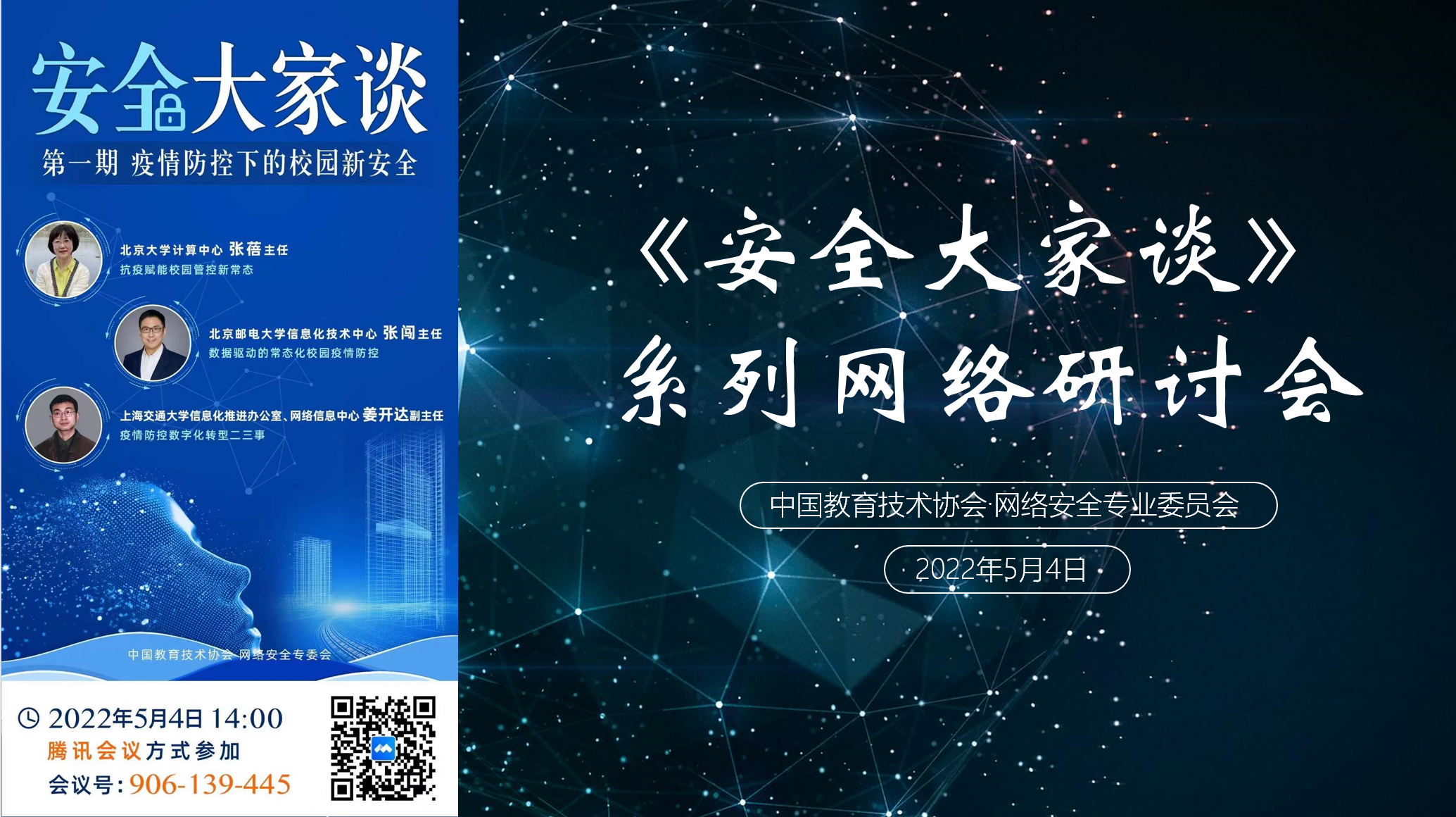 在“五四”青年节来临之际,围绕当前网信工作热点,中国教育技术协会网络安全专委会主办的“安全大家谈”系列研讨会第一期以“疫情防控下的校园新安全”为主题,在云端成功举办。